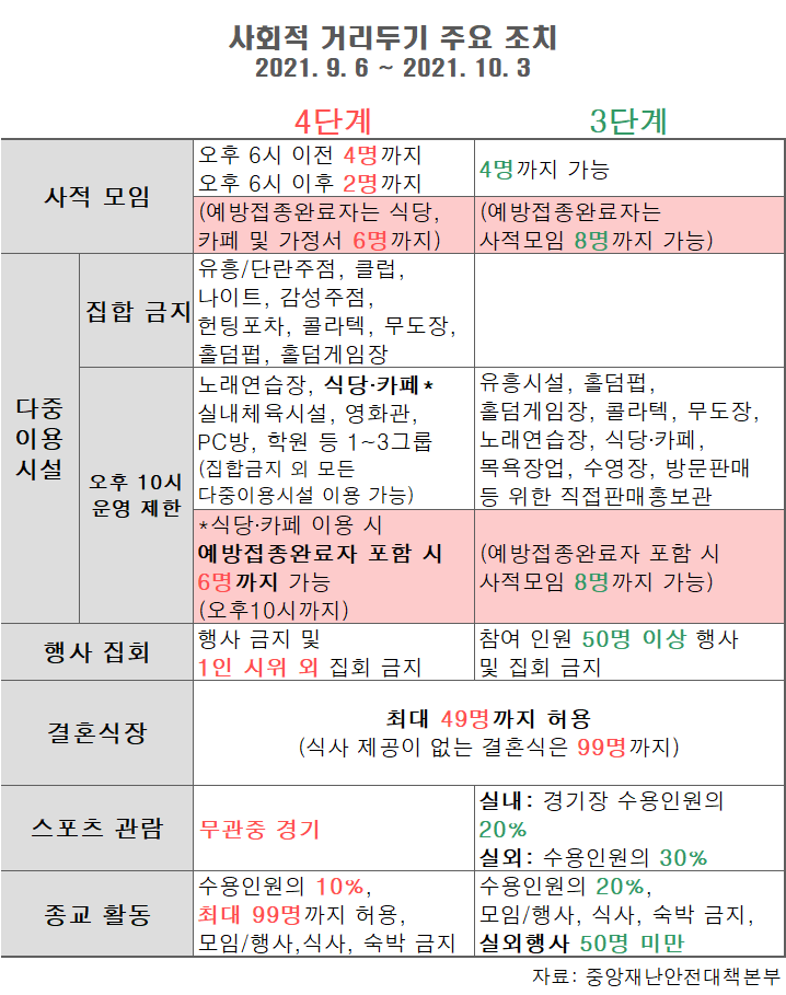 눈에 띄는 점은, 백신접종을 마친 사람이 포함 시 모임 인원이 늘었다는 건데요. 4단계 기준, 식당 및 카페, 가정에서 6명까지 모일 수 있도록 완화되었습니다. 하지만 1차 접종자와 미접종자는 이전과 동일하게 오후 6시 이전 4명, 오후 6시 이후 2명까지만 가능합니다.
